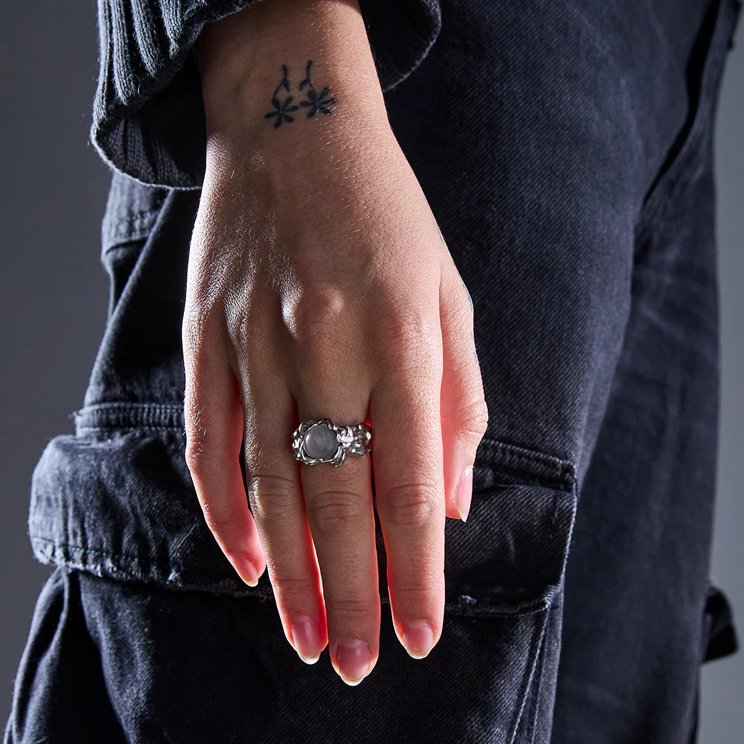 The curves and lines of the ring reflect the dance of spirits, capturing their essence in a tangible form and the translucent Moonstone that reflects mystical colors.